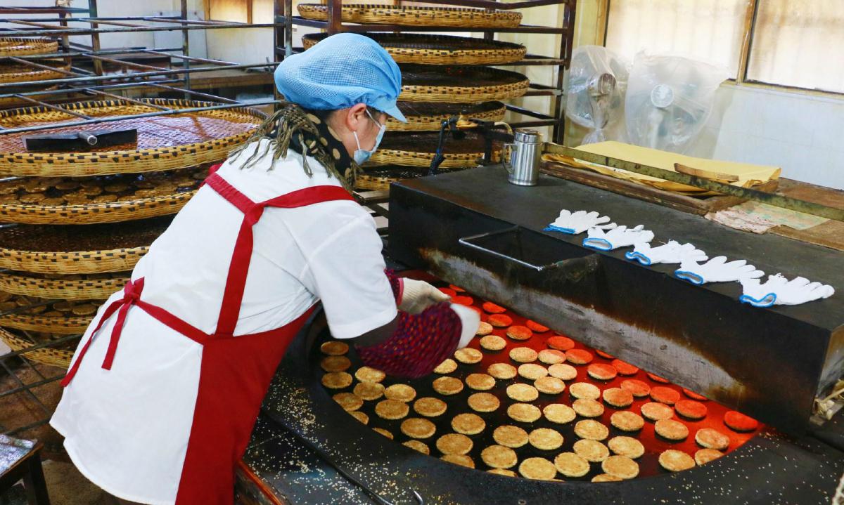 和面、包馅、打饼、摇麻、烘烤……晨光熹微,老下陆街58号益朵港饼厂内,30多名工人在紧张忙碌着。